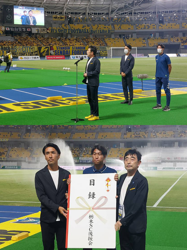 アカデミー支援の一環として、皆様からお預かりした浄財より、戦術研究に活かしチーム飛躍に貢献出来るよう、監督スタッフから要望があった自動追尾機能搭載のビデオカメラを贈呈しました。 後援会は今後とも物心両面で栃木SCを支援して参ります。